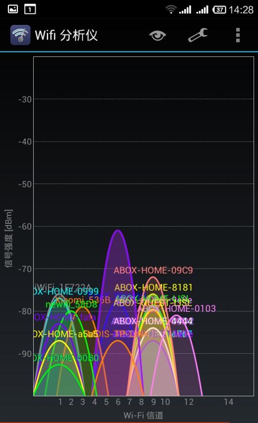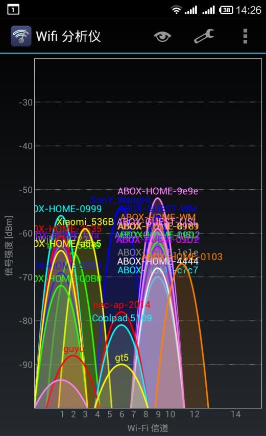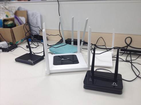 测量信号,我们用这个软件,叫做WiFi分析仪,还有一个就是PC端鼎鼎有名的WirelessMon。我们信奉没有比较,就没有鉴别的理念,还是比一比更真实。我们选取了智能路由比较有代表性的三款产品(极贰路由、newifi、小米路由器mini)和一款普通明星产品(TP-LINK)。