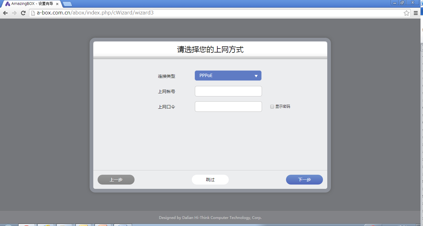 这一步比较特别,直接点下一步好了。下面是上网方式,根据实际状况设置,大多数人肯定是PPPoE跑不了。不过也可以选择跳过,厂家说,如果使用一段时间后想重置系统的话,可以选择跳过,这样原来的设置还会保存,对于广大PPPoE拨号的同志来说,不用再输入帐号和密码,这真的是太赞了。