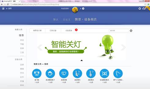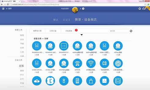 AmazingBOX号称独有三级扩展体系,果然不错。是三级。插件中心,设备商店,情景商店。