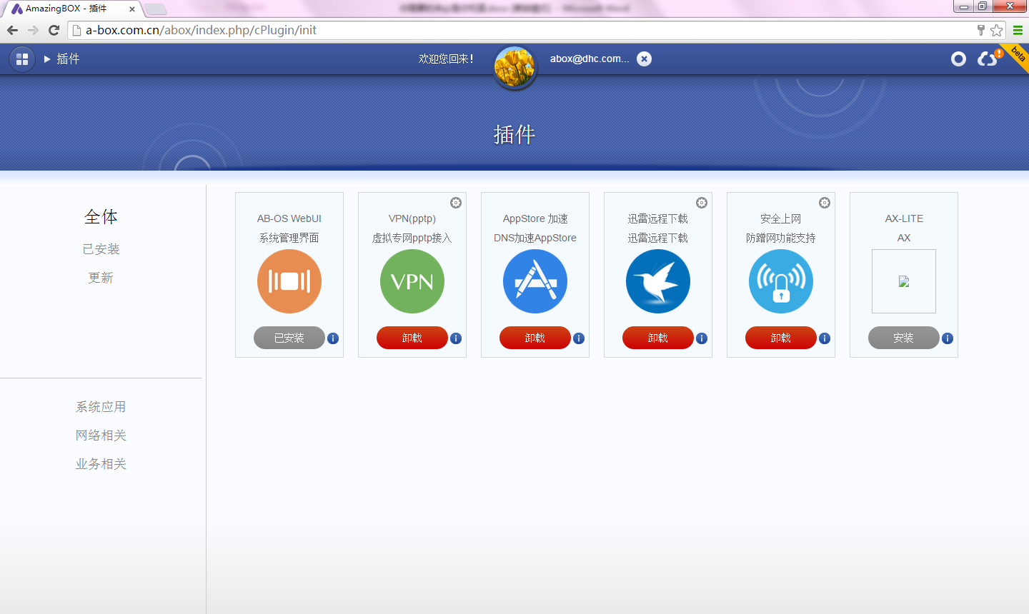 下面重点介绍插件中心。和别的智能路由类似的样子,但AmazingBOX解释说,思路不一样,AmazingBOX将基础功能的增强定位为插件,至于定时开关wifi则认为是应用扩展,建议用户通过情景商店或自己编写情景来实现。这样的好处就是可以不用担心插件把系统搞死了。